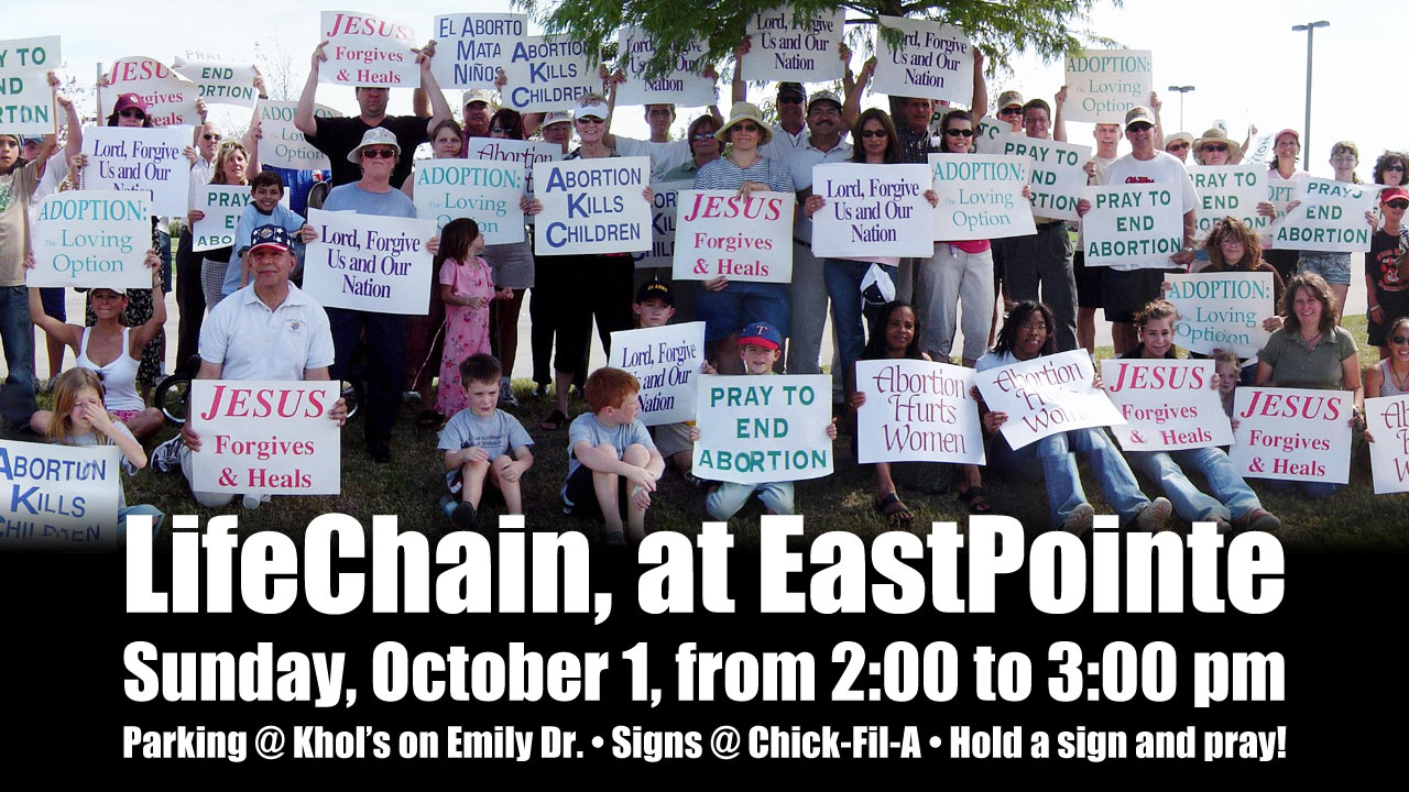 Life Chain is a one-hour (60-minutes) silent prayer chain and public witness against abortion. Christians will stand up and pray on behalf of our voiceless preborn citizens and seek God’s divine intervention for the healing of our community and nation and the ultimate end of abortion. This must be done humbly in the true spirit of II Chronicles 7:14.