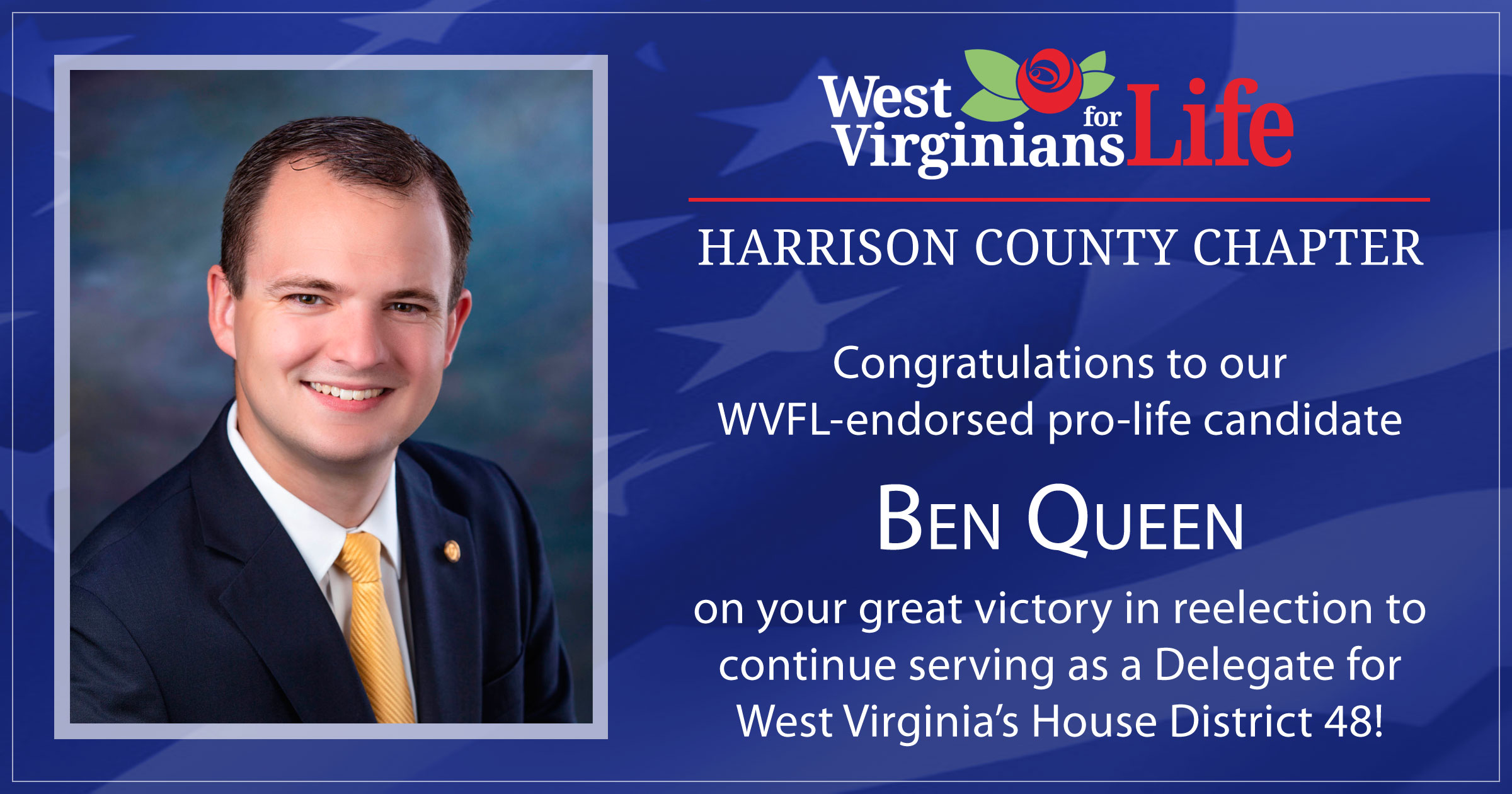 The WVL-PAC enjoyed wins in all six statewide races. Patrick Morrisey won the governorship with 69% of the vote. JB McCuskey will be the new Attorney General ensuring that pro-life legislation will be defended if challenged. Kris Warner easily won the Secretary of State seat. Mark Hunt will be the State Auditor. Kent Leonhardt will remain Agriculture Commissioner.
